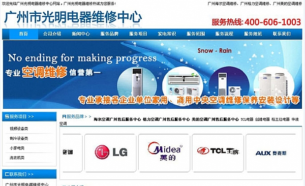 廣州市光明電器維修中心是一家專業的家電維修服務公司。我們擁有實力雄厚的技術,一流的服務,現代化管理,優秀的團隊。是我市一家技術全面的家電維修公司。 廣州市光明電器維修中心自成立以來,不斷吸收現代管理企業的先進經驗,對應各類家用電器和空調維修的每個分類具有高等技術人才,有著相當準確快捷的維修、搶修能力。在管理上,公司全部多元化電腦管理,維修資料齊全、客戶資料齊全做到每戶回訪。同時我們與國內眾多知名品牌的電器廠商與零件供應商具有密切的往來關系,承擔國內一些優質產品的保修、維修任務。 廣州市光明電器維修中心官方網站:www.gzgmjd.com |
