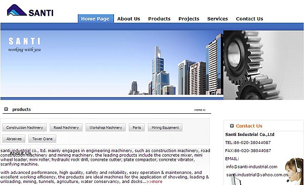 Santi Industrial Co., Ltd. mainly engages in engineering machinery, such as construction machinery, road construction machinery and mining machinery. The leading products include the concrete mixer, mini wheel loader, mini roller, hydraulic rock drill, concrete cutter, plate compactor, concrete vibrator, scarifying machine.
