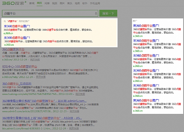 360搜索推廣平臺是整合了360導航、360搜索等平臺的豐富展現位置,覆蓋海量互聯網用戶,擁有超過90%市場滲透率的綜合營銷平臺。 360搜索推廣平臺360搜索推廣平臺擁有多種特色營銷產品,包括"猜你喜歡","搜索推廣","品牌直達"等,滿足不同企業的不同推廣需求。具有資源豐富,精準定位,操作簡單,智能高效等特點。 資源豐富——覆蓋360導航、360搜索等眾多流量入口,豐富的展現位置和展現形式,滿足企業的多樣化需求。 操作簡單——人性化設計,投放流程快捷,操作簡單靈活,只需要開通賬戶即可實現自助式投放。 智能高效——專業的統計方法和多種數據報告,保證推廣的科學性和嚴謹性;只按效果收費,真正實現更低投入,更高回報! 360點睛營銷平臺,讓營銷更有價值! 搜索推廣搜索推廣是基于360搜索,通過關鍵詞定位目標用戶的營銷產品。 360搜索擁有優質流量,通過關鍵詞精細化投放,能夠準確鎖定用戶,覆蓋整個投放流程,讓有需求的用戶更快找到企業和產品信息。只要在360點睛營銷平臺開通賬戶,便可實現自助投放;更有批量導入工具,操作簡便靈活,幫助您迅速開始制作創意。 搜索推廣的創意由標題、描述和鏈接網址共同構成;創意將展示在搜索結果的上方和右側。 采用效果付費模式,根據實際有效點擊收費,擁有海量免費展現機會。幫助客戶實現成本可控,效益可觀,超值回報盡在掌握。 |